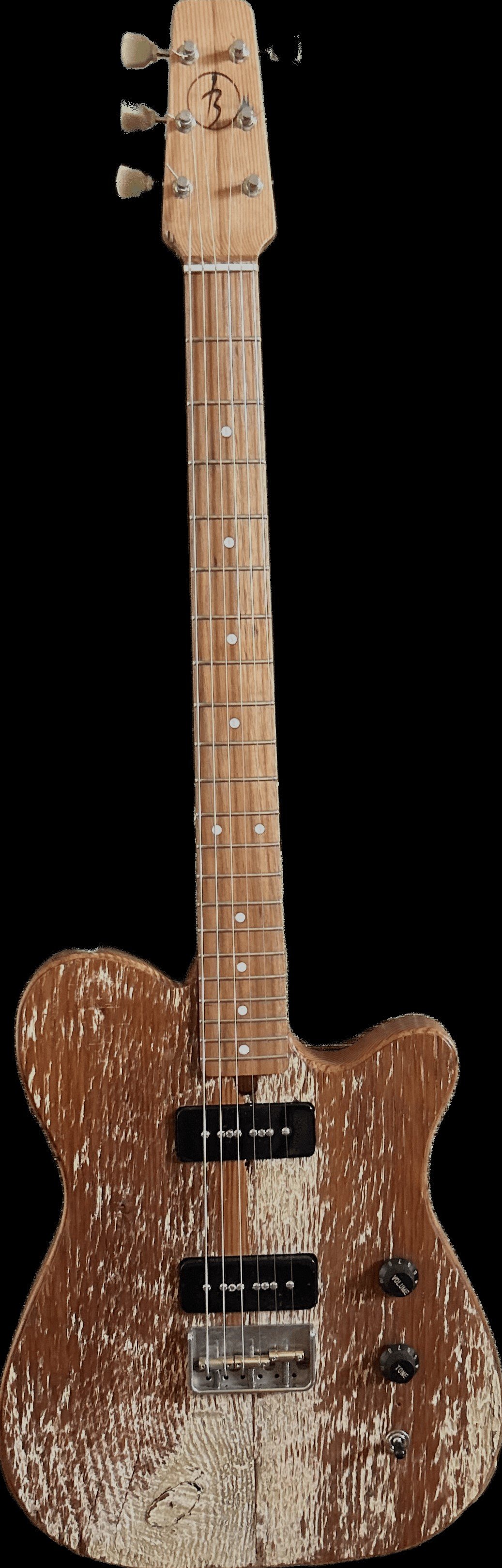 Crafted with precision and a nod to history, this electric he “Hoop Pinecaster” electric guitar features an antique hoop pine body, offering a unique resonance from a century of weathering.